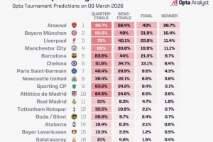 体育资讯3月10日讯 欧冠1/8决赛即将开战,Opta超级计算机预测了各队晋级8强的概率,并列出榜单。