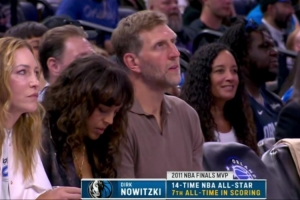 镜头捕捉到,独行侠名宿诺维茨基来到现场观看比赛。