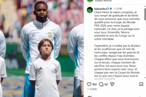 巴坎布社媒晒出自己在国家队的照片,并写道:“亲爱的刚果兄弟姐妹们,我怀着无比的感激与自豪向大家宣布——我们的国家队已成功晋级2026年世界杯!这个梦想,我与你们所有人共同分享。让我们携手在世界舞台上发出刚果的声音。”