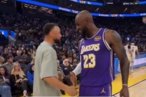 詹姆斯和库里赛前开心寒暄 镜头给到库里穿的詹姆斯10代签名鞋