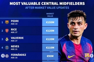 体育资讯4月11日讯 《转会市场》统计了中前卫位置球员身价情况,佩德里等4人身价均超过1亿欧元。