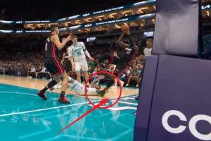 这不看回放?三球用手扒阿德巴约脚后跟致其倒地受伤 已提前退赛